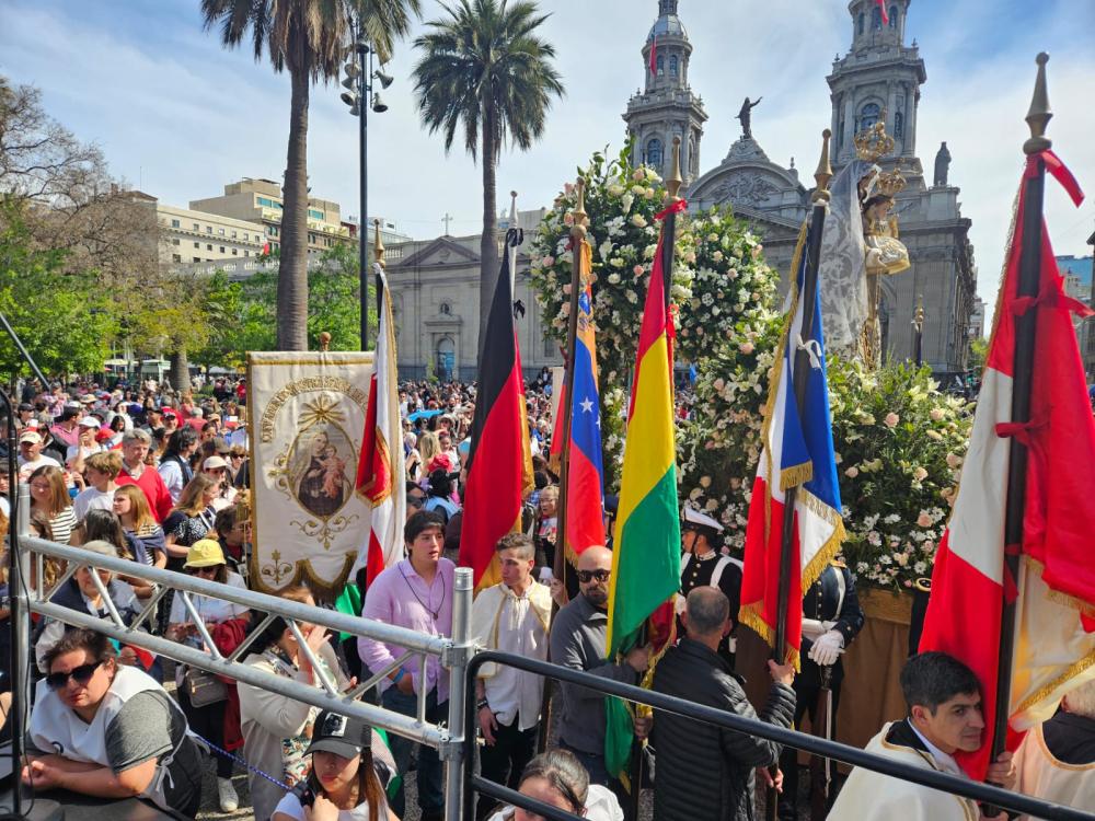 Cerca de 10 mil personas se congregaron este domingo en la Plaza de Armas para participar en la tradicional procesión de la Virgen del Carmen, patrona de Chile. La jornada comenzó a las 15:30 horas con bailes folclóricos en honor a la Virgen y continuó con un recorrido por las principales calles del centro de la capital. El cardenal Fernando Chomali, arzobispo de Santiago, presidió por segunda vez esta celebración en el marco del Día de Oración por Chile, acompañado por el nuncio apostólico, monseñor Kurian Mathew Vayalunkal.